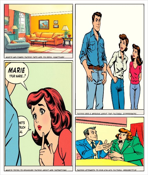 Main character: Thiego, Marie Setting: Marie's house Problem: Speaking loudly is perceived as anger in France Solution: The characters explain their customs and try to understand each other's culture