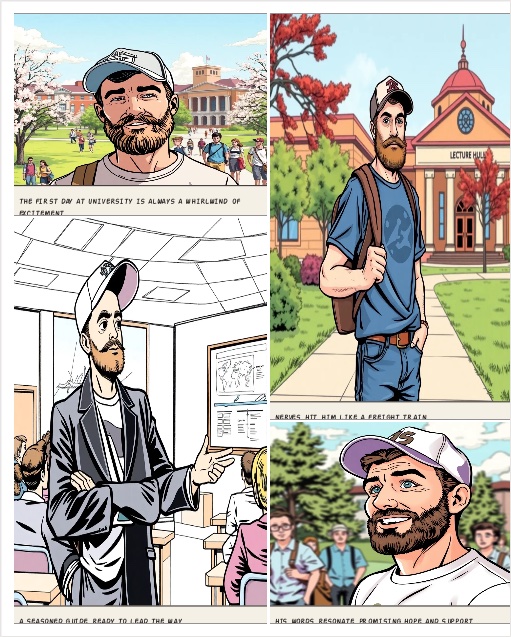 A 35 year old man going back to school and experiencing his first semester. His Professor is an African American male, well dressed with a bald head and neatly trimmed beard. Class is to teach new students how to navigate through campus resources, how to utilize use the campus tools to submit assignments, and the importance of self care.
