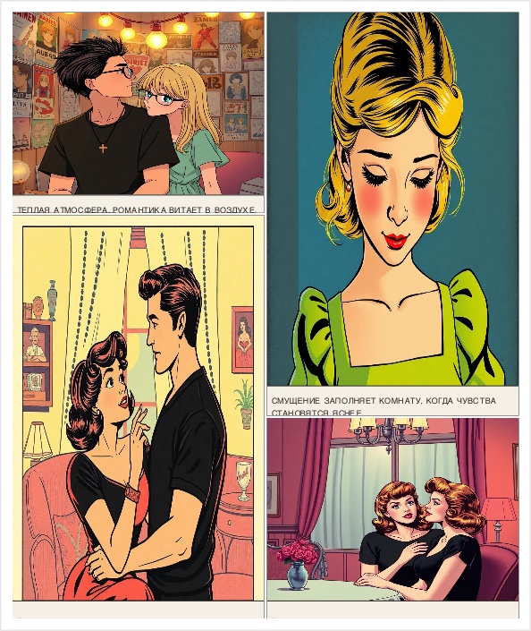 Настрой комикса: романтика и похоть Панель 1: Данная ситуация происходит в уютной комнате, на фоне которой есть плакаты разных аниме и светодиодная лента. Парень в очках с темно-русыми волосами, которые зализаны чуть назад, но торчат несколько волосков, карие глаза, узкий разрез глаз, в черной футболке и с ожерельем, где висит крестик, шепчет девушке в очках с челкой, с э волосами цвета блонд, карими глазами в нежно-зеленом платье: «Ты такая милая» Панель 2: Девушка смущается и смотрит чуть в бо