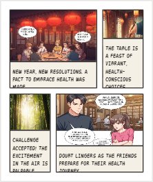 Comic Title: The Healthy Toast Panel 1 Scene: A brightly lit, modern Chinese restaurant. Eight friends (4 male, 4 female, all Chinese, ages 25-35) sit around a large round table. They wear casual, stylish clothing in various colors. Red lanterns hang overhead. Speech: Alright everyone, health is wealth this year! No fried stuff, no sugary desserts! Caption: New year, new resolutions. A pact to embrace health was made. Panel 2 Scene: Close-up on the table. Chopsticks point to various dishes: s