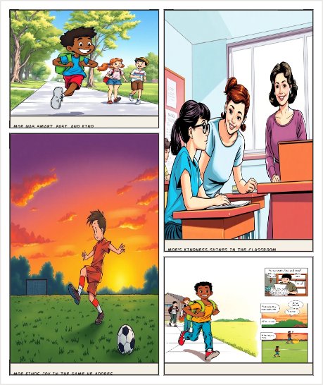 Panel 1 Wide shot. Moe, a smiling Black middle school boy with a backpack, sprints past two friends on a sidewalk. Caption: Moe was smart, fast, and kind. Friend: “Moe! Slow down!” Panel 2 Inside a classroom. Moe leans over to help a classmate with a worksheet. Moe: “Try breaking the problem into steps.” Teacher (smiling): “Great helping, Moe.” Panel 3 After school. Moe practices football alone on a small field as the sun sets. Moe (thought bubble): “I love this game.”