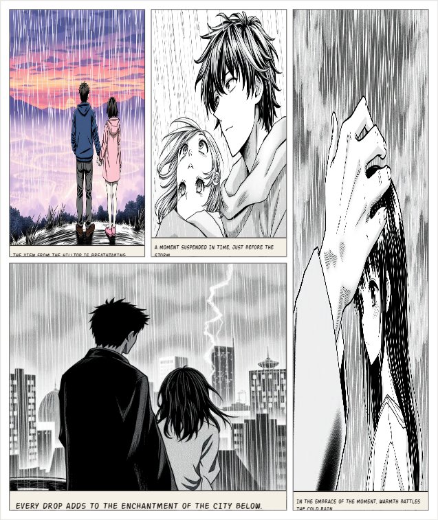 a man and a girl holding each other hand standing at a top of hill from there they can see the whole city glowing then rain slowly started so the man keeps her hand on the girl head