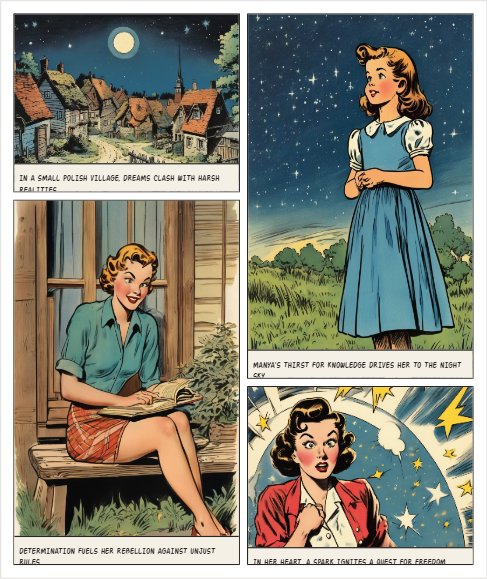 Marie: La Ragazza che Inseguiva la Luce C'era una volta, in una terra chiamata Polonia, una bambina di nome Manya che aveva una fame incredibile, ma non di dolci: lei aveva fame di sapere. Guardava le stelle e gli oggetti, chiedendosi di cosa fosse fatto il mondo. A quel tempo, però, c’era una regola molto ingiusta: le ragazze non potevano andare all’università.