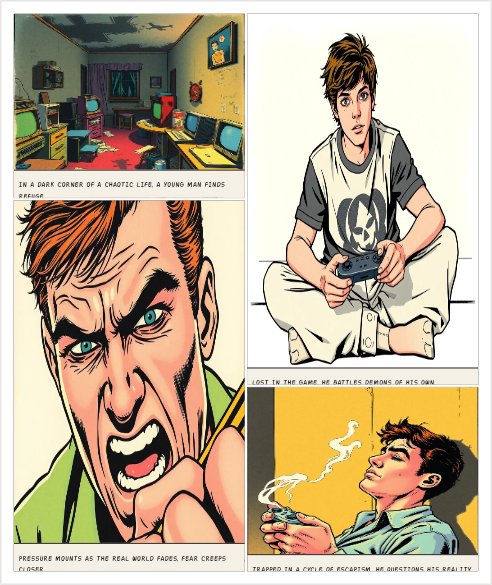 A tormented by demon of fear young man trying to run away from it in pleasure of videogames and drugs