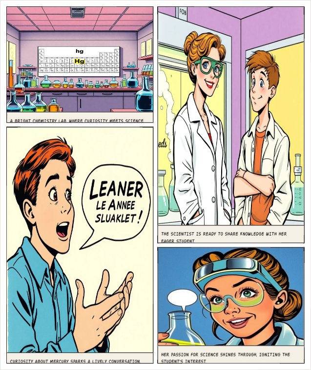 Comic Generation Prompt (Step-by-Step) Style & Format Educational comic strip, clean line art, bright but scientific color palette 6 panels, clear speech bubbles, simple labels Friendly, curious tone for a beginner learner Setting Modern chemistry laboratory with beakers, test tubes, fume hood, periodic table on the wall Element Hg (Mercury) highlighted on the periodic table Characters A calm, friendly scientist wearing a lab coat and safety goggles A curious learner (student) asking q
