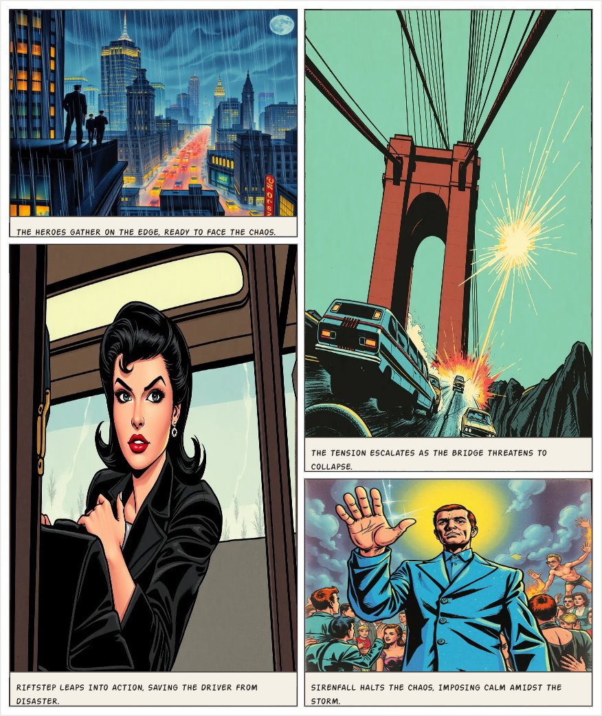 A rain soaked city glows at night. Five heroes stand on a skyscraper edge watching traffic far below. A suspension bridge cable snaps and cars skid as sparks fly. Riftstep appears inside a falling bus grabbing the driver. Sirenfall lifts her hand and the chaos freezes into silence. Pale Iron merges with twisted steel supports. Emberwake surrounds civilians with calm blue fire. Fluxbound strains holding the bridge together as light cracks across his arms. In a shadowed alley a criminal stares at