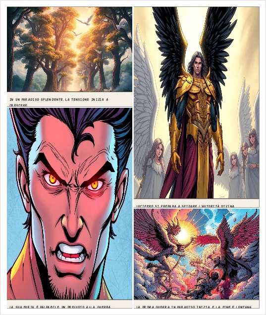 Crea una storia ispirata a paradise Lost di John Milton. Lucifero che sfida Dio, prima guerra in paradiso e viene scacciato insieme al suo esercito precipitando all inferno. Lì fonda pandemonio e con il suo esercito giura vendetta.