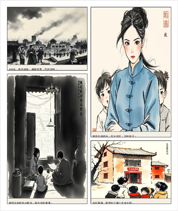 第一格(左上): 1937年南京城破,黑暗籠罩,百姓驚惶 第二格(右上): 一位年輕教師在廢墟中保護孩子們,眼神堅定 第三格(左下): 教師在秘密場所教孩子讀書寫字,窗外是危險的街道 第四格(右...