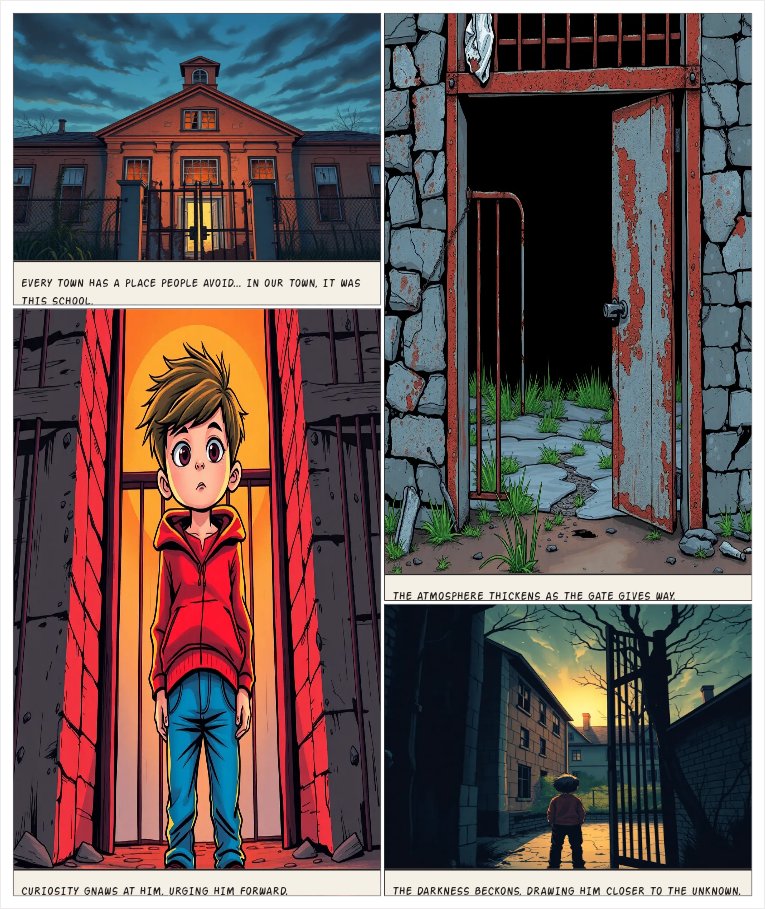Wide shot of an old, broken school building at dusk. Rusted gate creaking open. A faded board r...