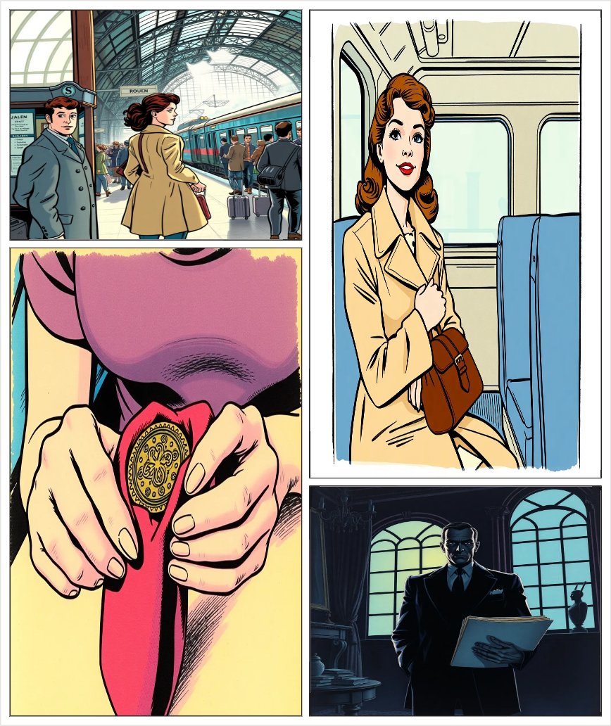{ "title": "The Rouen Rendezvous", "panels": [ { "panel": 1, "scene": "Busy t...