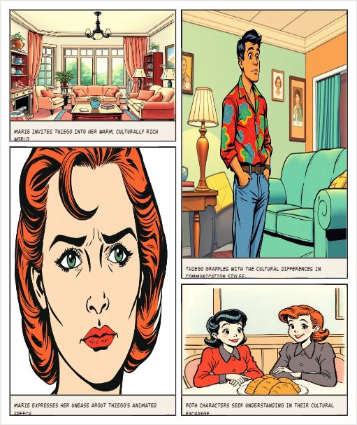 Main character: Thiego, Marie Setting: Marie's house Problem: Speaking loudly is perceived as anger in France Solution: The characters explain their customs and try to understand each other's culture