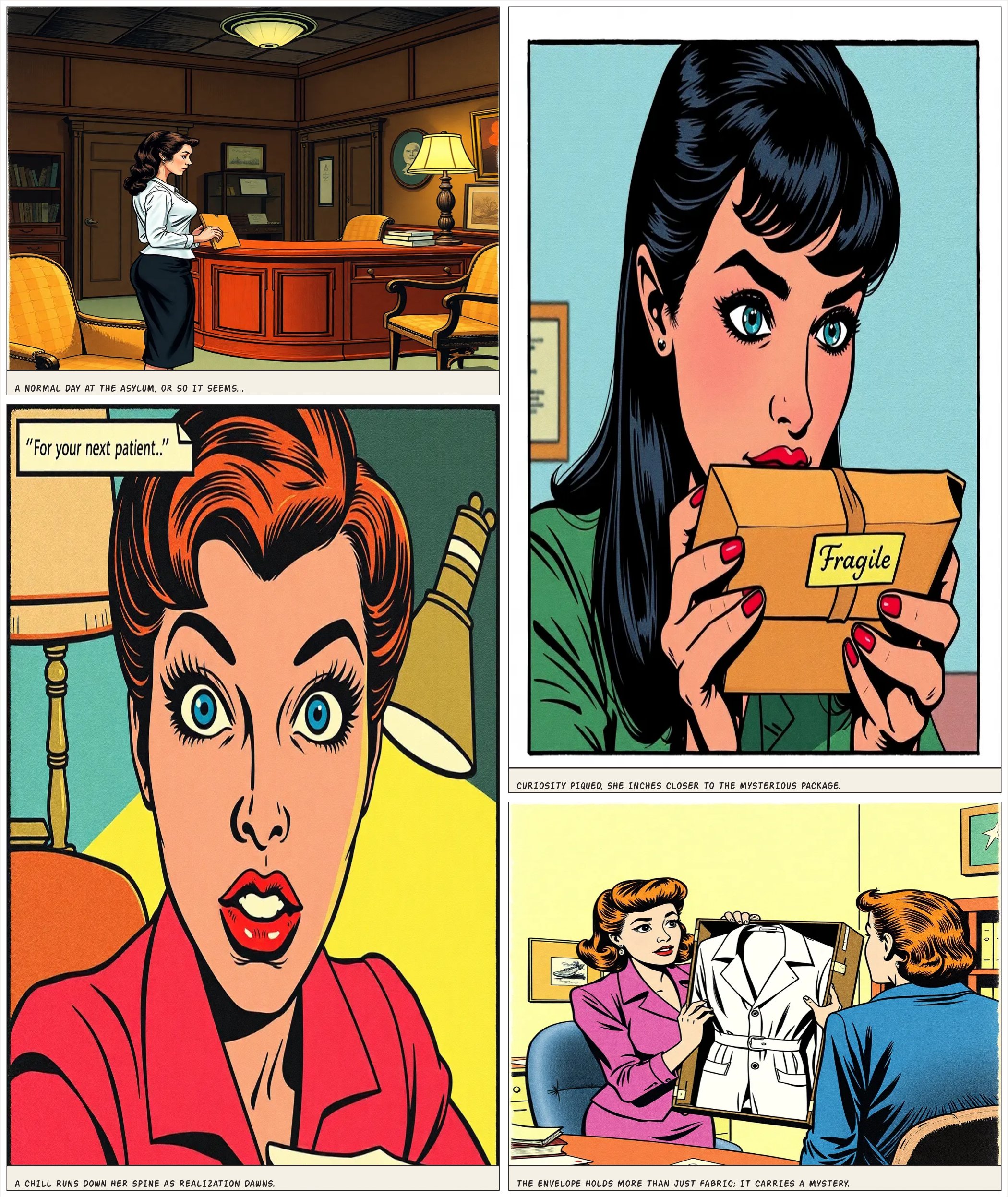 In an office of an asylum. The secretary, a pretty woman with a pencil skirt recieves a package in the mail. In the package is a straitjacket