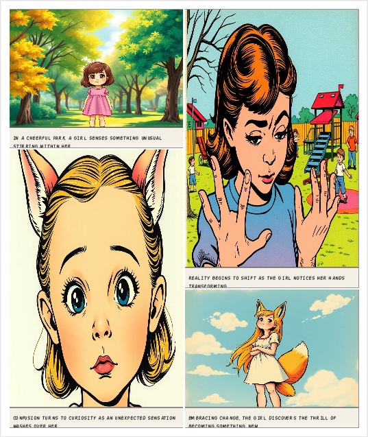 A cute young girl transforms into a very cute attractive fox with straight long blonde hair. At first the girl is confused about what is happening to her but then she realizes that the transformation feels very good and she likes it.