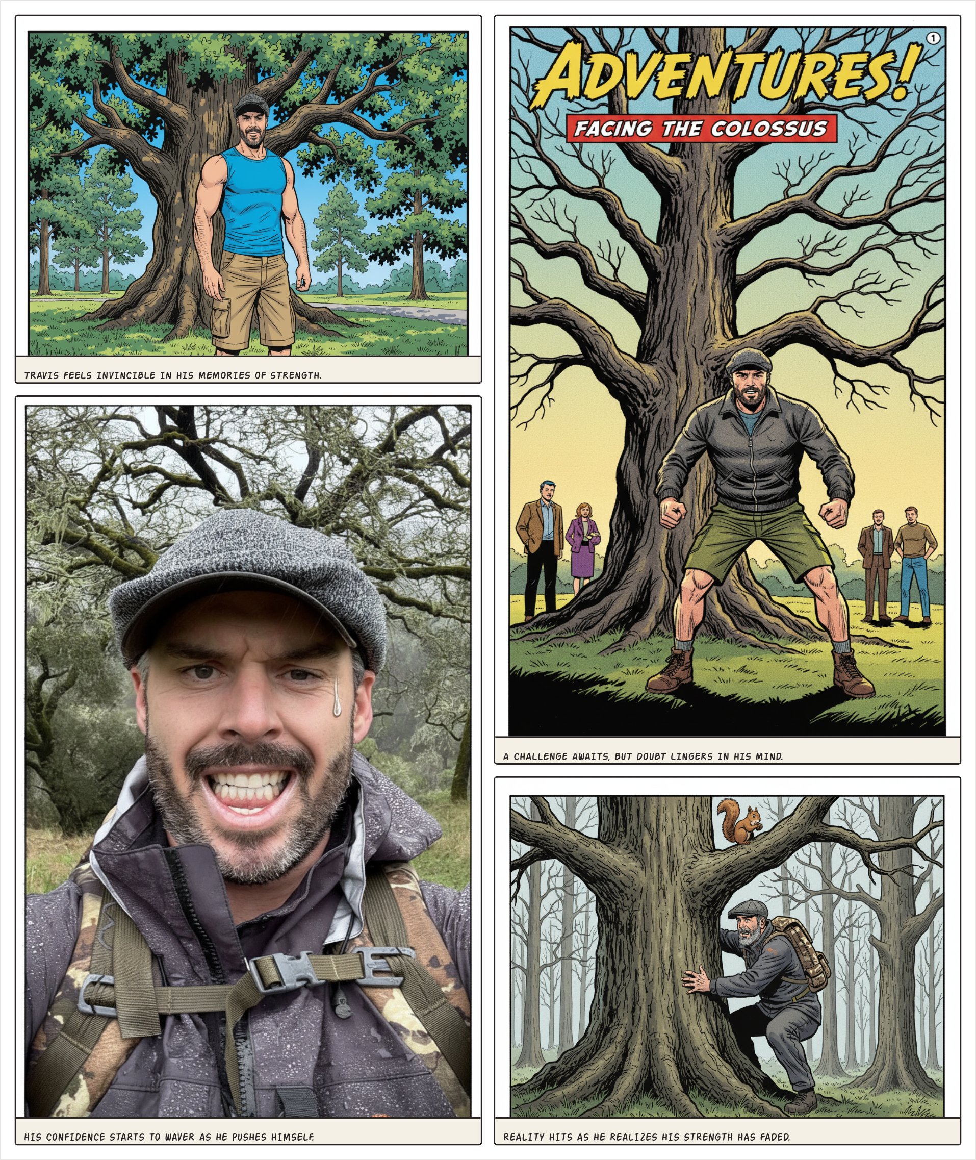 Travis tries to lift a tree but realizes he is not super strong anymore