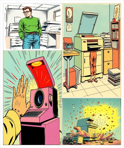 Pannello 1 uomo di 57 anni di nome Paolo capelli corti all'indietro grigi con gli occhiali vestito maglione verde oliva e jeans in piedi davanti alla fotocopiatrice pannello 2 la fotocopiatrice è in funzione ( con effetti sonori) pannello 3 primo piano della fotocopiatrice che è in funzione ( con effetti sonori) pannello 4 la fotocopiatrice esplode ( con effetti sonori)