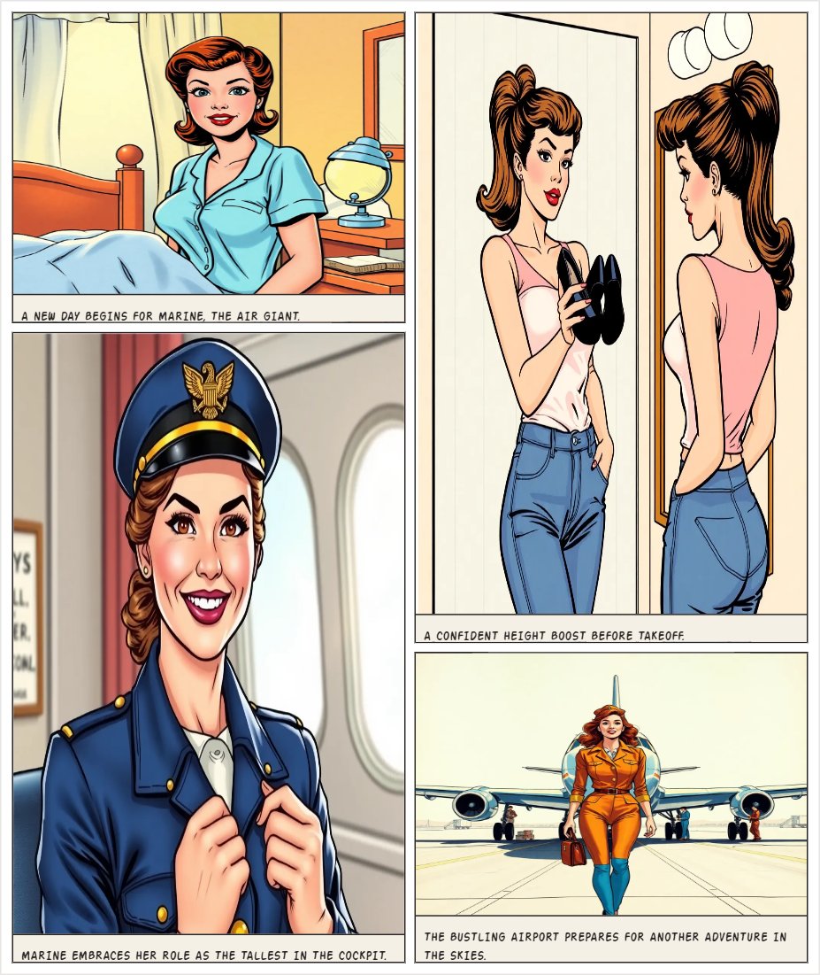 Titre : « Marine et la géante des airs » Planche 1 : Le réveil Case 1 : Marine dans son lit, réveil qui sonne. Texte : « 6h30… encore une longue journée dans les airs ! » Case 2 : Marine devant le miroir, talons à la main. Texte : « Avec ça, je frôle les 1m80… la classe ! » Case 3 : Elle enfile son uniforme, sourire confiant. Texte : « Toujours la plus grande dans l’avion, comme d’habitude ! »