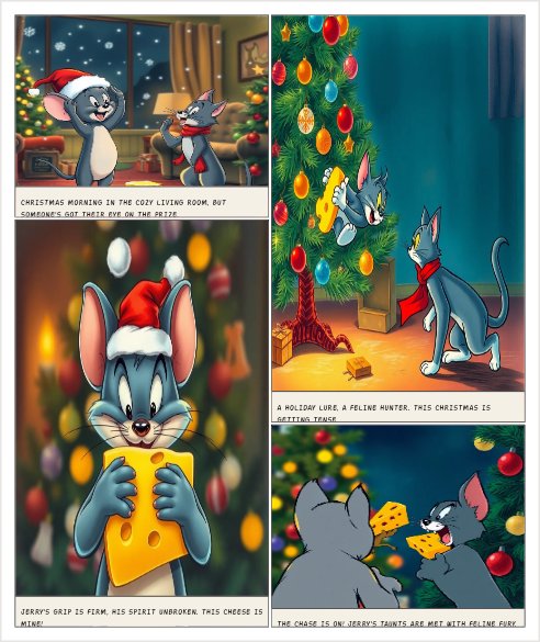 Panel 1 Setting: A cozy living room glowing with Christmas lights. Snow falls outside the window. Jerry (grinning, holding a shiny piece of cheese): “Ho ho ho! Looks like Santa left me the best Christmas gift!” Tom (eyes wide, licking his lips): “Hey! That cheese is way too big for a tiny mouse like you!” Panel 2 Setting: Near the Christmas tree, ornaments shaking as Tom tiptoes closer. Tom: “Be a good mouse for Christmas and hand it over, Jerry.” Jerry (hugging the cheese tightly): “Not a chanc