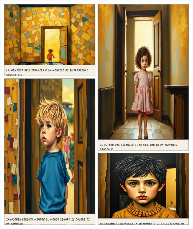 Vignetta 1 “I miei primi ricordi non hanno immagini. Hanno odore.” Vignetta 2 “Avevo tre anni quando ho capito che il silenzio può fare più rumore di un urlo.” Vignetta 3 “Nessuno mi spiegò cosa stava succedendo. Il mondo andò avanti senza di lei.” Vignetta 4 Valentino: “Io resto con te.” “Da quel giorno non siamo più stati solo fratelli.”