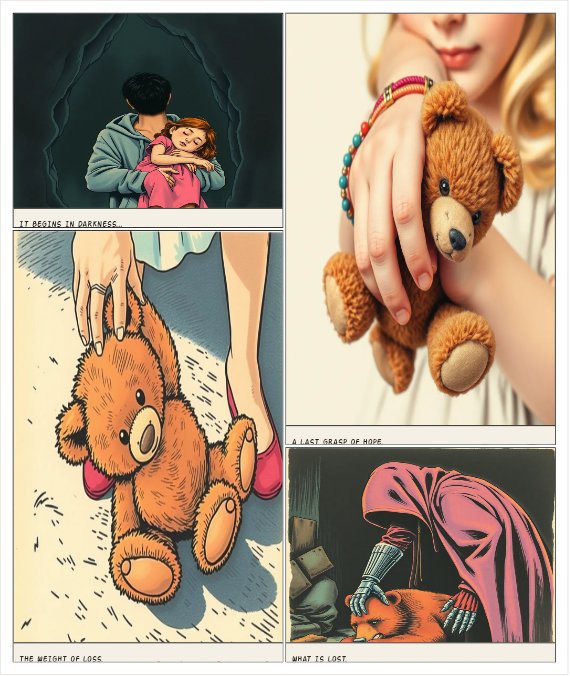 Page 1 Panel 1 (Wide, dark opening): Blackness. Slowly, a father emerges carrying his limp daughter horizontally in both arms. Narration: “It begins in darkness…” Panel 2 (Close-up): The girl’s small hand clutches a teddy bear with her last strength. Panel 3 (Close-up): The bear slips from her fingers, hitting the ground with a heavy thud. Panel 4 (Medium shot): A hooded figure’s robotic hand scoops up the bear. The cloaked back of the robot hurries away into shadow. Narration: “What is lost