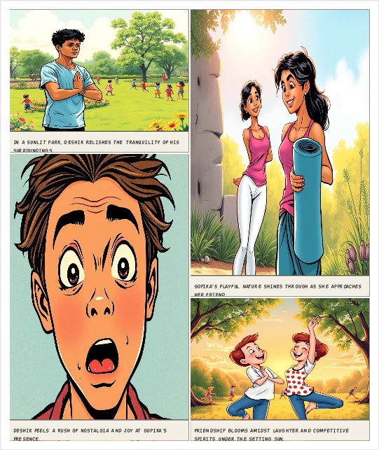Create a romantic webtoon-style comic (semi-realistic) with ~50 images and dialogues. Deshik (22, 12/06/2003) is caring, loyal, emotional; Gopika (20, 03/08/2005) is pure, sincere, strong, and loving. They meet as neighbors in 4th standard during summer yoga classes, becoming playful friends. Gopika moves away, leaving silent pain. On Dec 27, 2019, she likes his Instagram posts; he texts “Hi” and they reconnect. On Dec 31, she shows an earring he gifted as a child. At New Year 2019 midnight, he