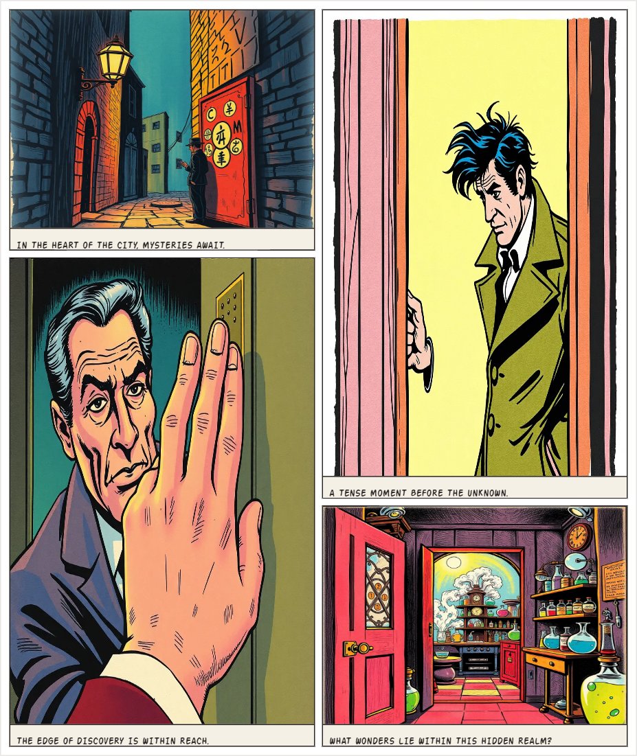 make a anime comic strip. it shows mr mysterious opening the hidden door to his lab