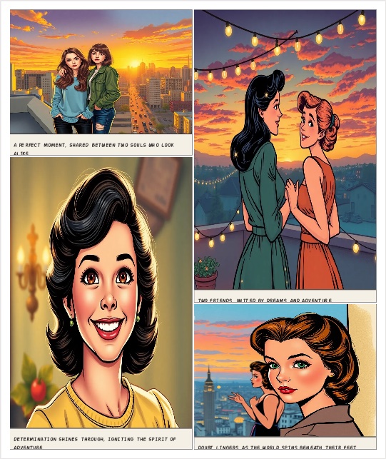ПЕРСОНАЖИ Две девушки, одинаково выглядят во всех кадрах. Азиза: 20 лет, длинные коричнево-русые волосы с длинной чёлкой, карие глаза, мягкие черты лица, слегка припухлые губы, ямочки при улыбке. Девушка 2: 20 лет, прямые коричневые волосы, стрижка каре, зелёные глаза, аккуратный нос, спокойное, уверенное выражение лица.
