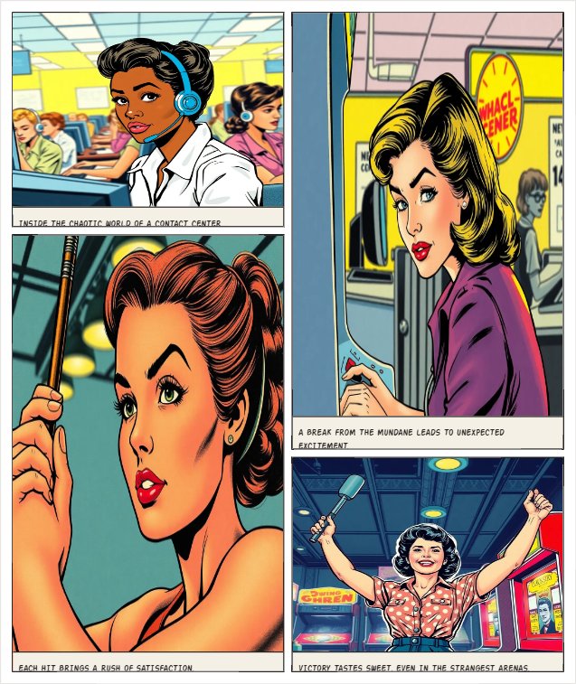 Marvel-style comic illustration of black woman contact center agent playing whack-a- mole