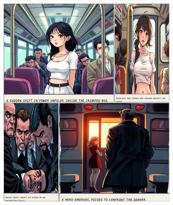 A Japanese girl stands near the center aisle, wearing a white tight shirt, a short mini skirt, her midriff visible, hair slightly moving as the bus brakes suddenly. Her expression is calm but alert. Around her, rough-looking mafia men are frozen in shock. At the open back door of the bus stands the hero, one foot inside, coat flowing, eyes sharp. One of the mafias is already knocked down near the seats. Hero (dialogue bubble): “Step away from her.” Caption at the bottom: Wrong bus. Right moment.
