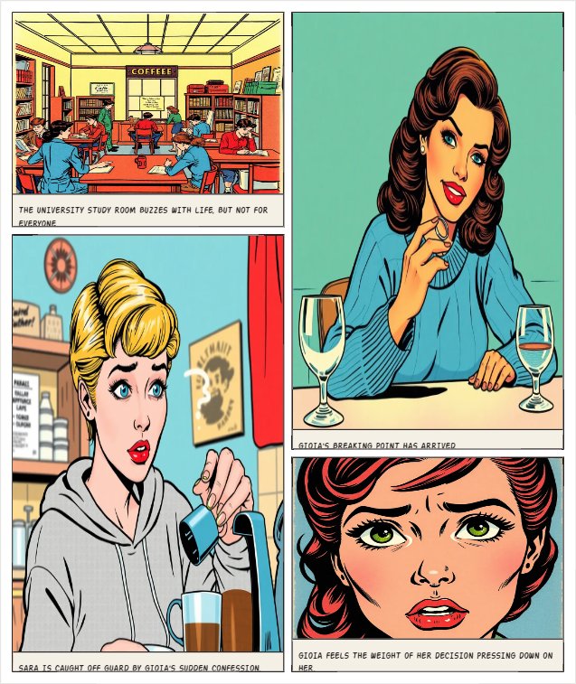 The smell of burnt coffee mingled with the low hum of conversation in the university study room. Sara and Gioia, as they did every day, had taken their usual table in the most secluded corner, two plastic cups in front of them. “I can't take it anymore,” Gioia blurted out, breaking the silence. Marco's ring was on her finger, but she was twirling it nervously. “I have to leave him.” Sara sipped her coffee, her eyes wide. “Leave Marco? But you've been together forever. Luca and I... I couldn't ev