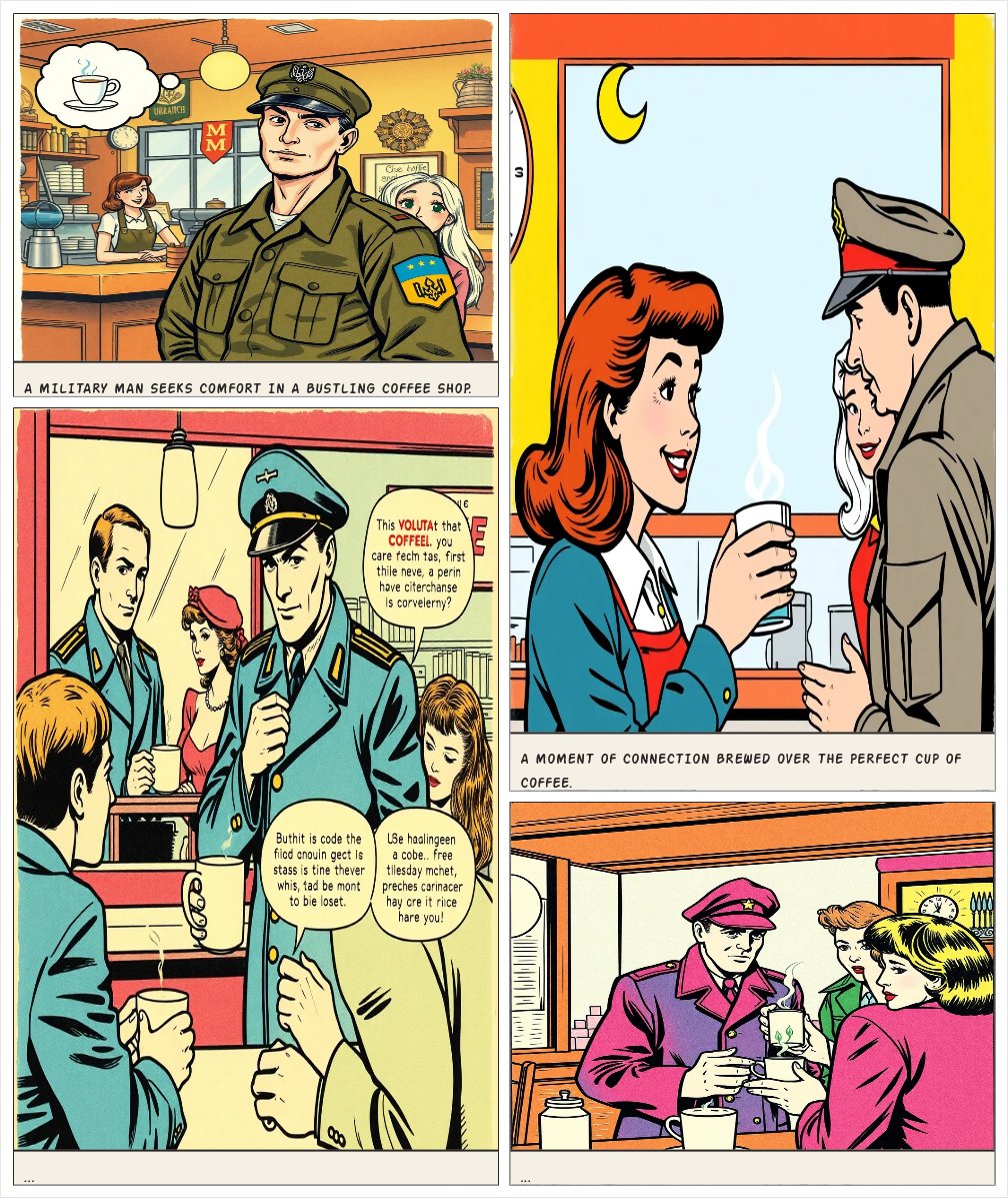 Сегенерируй мне комикс из 4 картинок: 1 слайд - Военный в камуфляже покупает кофе в кофейне. (у военного нашивка с флагом Украины) На фото он стоит внутри кофейни, за прилавком девушка бариста делает кофе, рядом с военным девушка с белыми волосами. Над военным как бы облачко что он думает о кофе (рисунок стаканчика с кофе). Облачко над девушкой баристой с смайликом луны черной. 2 слайд - Девушка бариста протягивет стаканчик с кофе военному улыбаясь. Облачко над девушкой баристой с смайликом луны