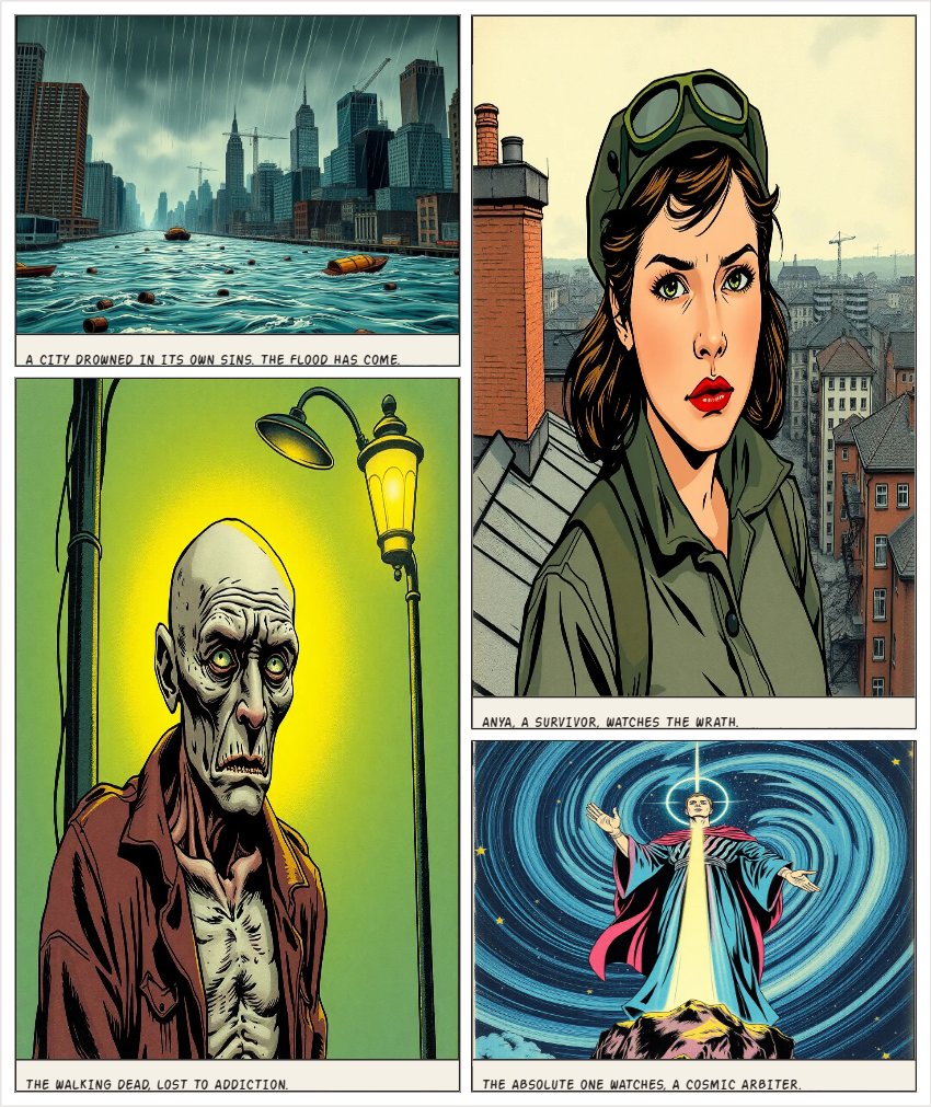 절대자가 지구별의 인간들의 만행(환경파괴로 폭우로 대홍수가 된도시 모습, 전쟁범죄자로 인한 어린이 부녀자 사망모습,,마약중독자로 좀비가된 인간, 음주운전으로 인간을 죽게만드는자)를 절대자가 재미있게 엄벌하여 경종을 울리는 이야기입니다