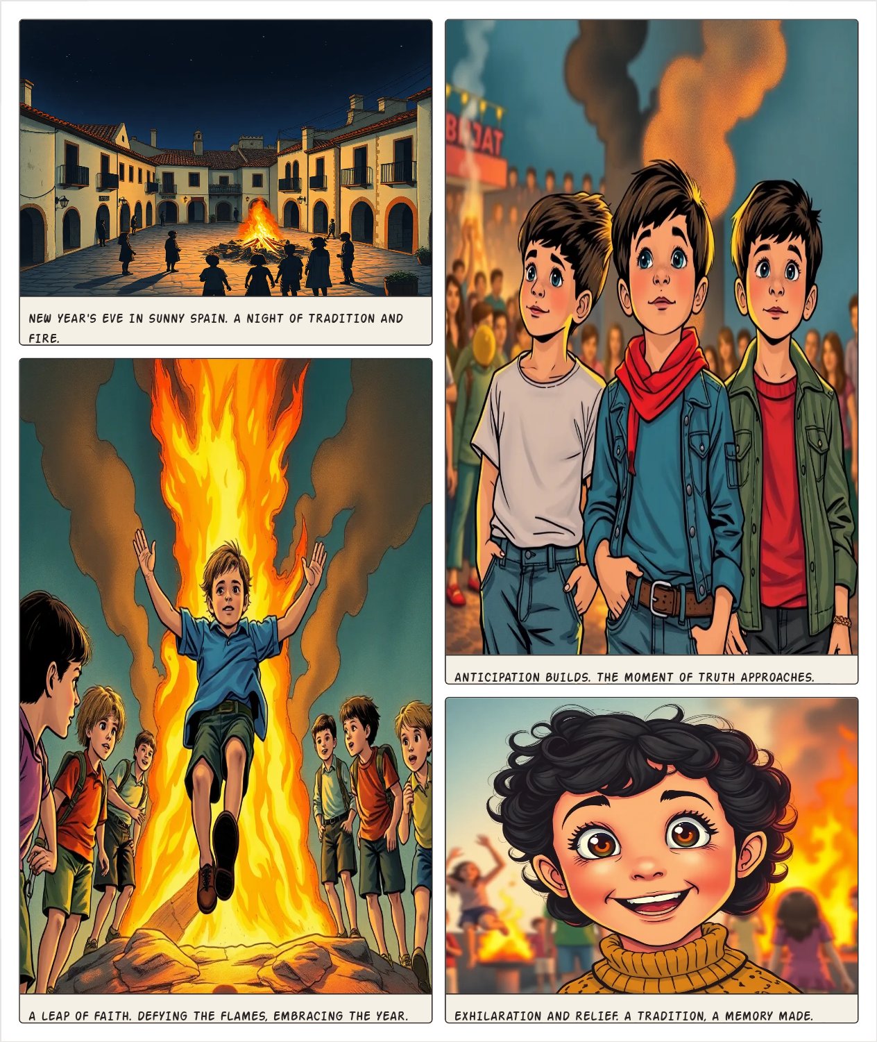 Spanish children jumping over the burning effigies and celebrating the new year