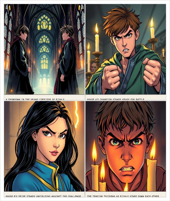 Panel 1 – Corridor Encounter: In a long, high-ceilinged corridor of the magical school, minimalist stained glass windows reflect the flickering light of floating candles. Two students from rival houses stand facing each other, about two to three meters apart, exchanging sharp, tense stares. Their robes sway slightly from a gentle draft, and their hair lifts with the wind. Candlelight highlights their faces, emphasizing the mix of anger, suspicion, and wariness as every step in the corridor feels