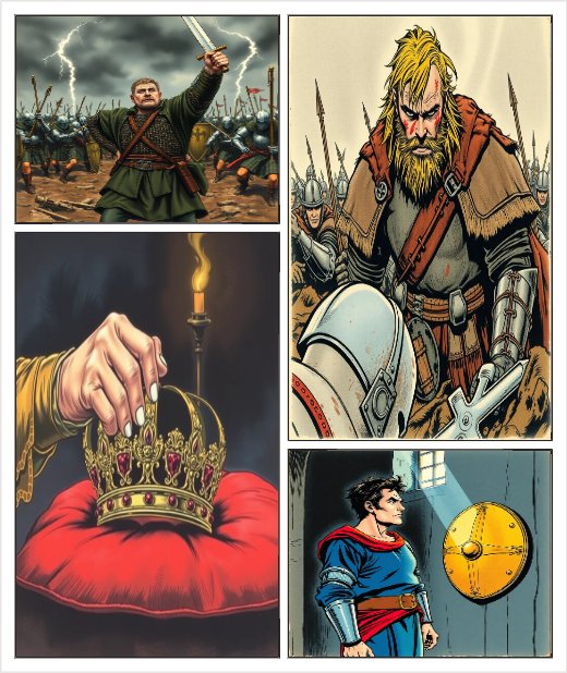 Make me a comic where the first 2 panels have Macbeth fighting as knight. Then show hw he is power hungry for the crown of scotland for the next 2 panels.