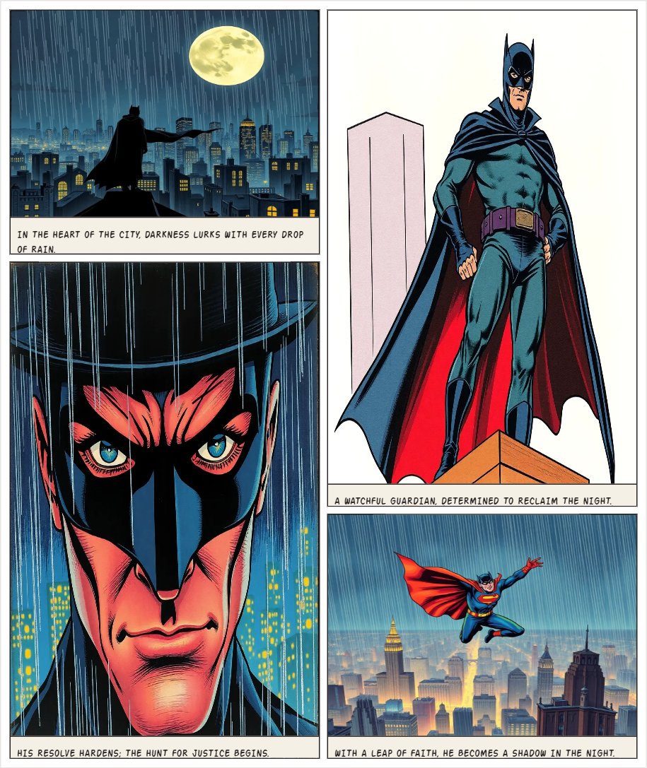 Dark noir western superhero comic panel. A masked vigilante inspired by Batman stands on a Gotham-like rooftop at night, cape flowing in the wind. Heavy black ink shadows, dramatic lighting, rain-soaked city skyline, moody atmosphere. Gritty DC-style comic art, bold outlines, cinematic angle, high contrast, serious tone, detailed background.