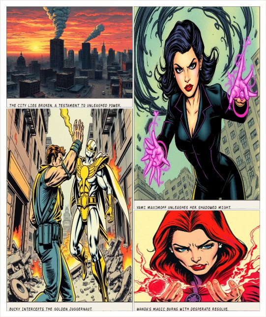 Escena Marvel: Yami Maximoff (traje oscuro con detalles morados, energía negra y morada) y Bucky Barnes (traje táctico de los Thunderbolts, brazo de vibranium) peleando contra Sentry (traje blanco y dorado, aura brillante) y Wanda Maximoff (traje rojo y morado, magia roja). Ciudad destruida al atardecer, estilo cinematográfico Marvel, acción dinámica.