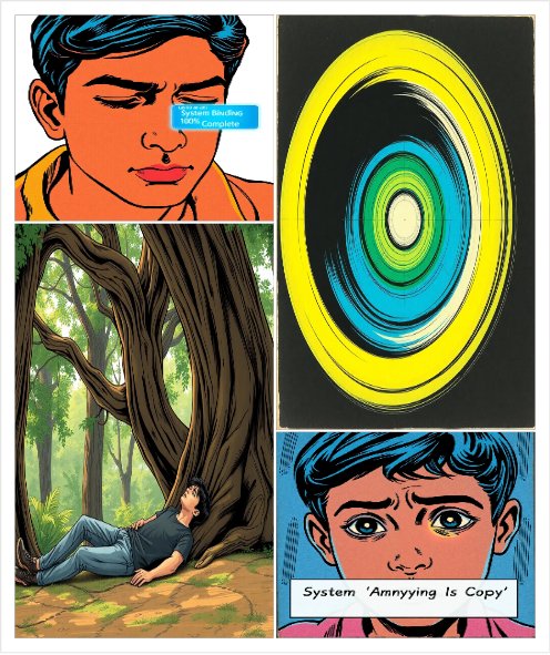 Chapter 2: The System – Anything Is Copy पॅनल 1: (मागील पानावरून पुढे) सिस्टीम बाइंडिंग 100% पूर्ण 'डन' असा मेसेज चमकतो. आरवचे डोळे मिटलेले दाखवावेत. पॅनल 2: गडद काळोख हळूहळू निळ्या किंवा हिरव्या रंगाच्या प्रकाशात बदलतो. पॅनल 3: आरव एका विस्तीर्ण जंगलात झाडाखाली झोपलेला दिसतो. manga स्टाईलनुसार तपशीलवार निसर्गचित्र. पॅनल 4: क्लोज-अप - आरव हळूवारपणे डोळे उघडतो. त्याच्या डोळ्यात किंचित गोंधळ, पण त्याचबरोबर एक नवीन चमक दिसते. सिस्टम पॉप-अप: (ट्रान्सपरंट बॉक्समध्ये) "सिस्टम 'Anything Is Copy' - 18-1