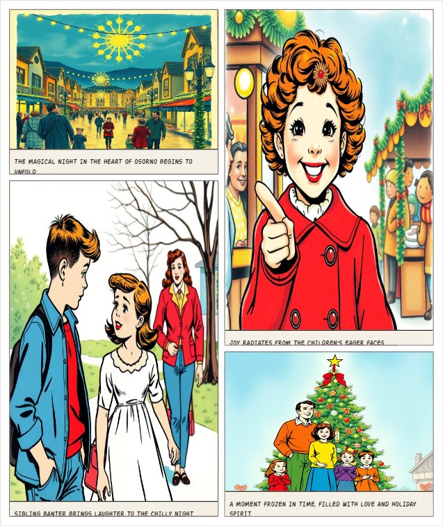 Cómic ilustrado navideño, estilo semi-realista. Familia de 4 personas caminando por la plaza de Osorno, Chile, 2025, de noche, con luces navideñas cálidas. Hermana joven delgada, 1.65 m, cabello rizado 3B. Hermano de 13 años, 1.68 m, rizado 3B con corte burfate, piel un poco más morena. Mamá 1.60 m, cabello lacio. Papá 1.80 m, pelo lacio corto estilo militar. Historia: caminan por la plaza iluminada y al final posan sonrientes frente a un gran árbol de Navidad. Ambiente familiar y festivo