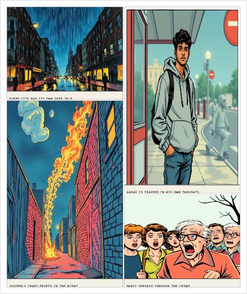 शीर्षक: “आग का जागरण” 🖼️ पैनल 1 दृश्य: रात का शहर, हल्की बारिश टेक्स्ट बॉक्स: “हर शहर की अपनी एक अंधेरी कहानी होती है…” --- 🖼️ पैनल 2 दृश्य: आरव बस स्टॉप पर खड़ा, उदास आरव (सोचता है): “क्यों लगता है… मैं यहाँ कुछ करने आया हूँ?” --- 🖼️ पैनल 3 SFX: धुआँ—धुआँ! दृश्य: सामने वाली गली में आग और धुआँ --- 🖼️ पैनल 4 भीड़: “आग लग गई है!” “कोई मदद करो!” --- 🖼️ पैनल 5 दृश्य: आरव दौड़ता है टेक्स्ट बॉक्स: “उसी पल… उसकी किस्मत जाग उठी।” --- 🖼️ पैनल 6 दृश्य: आग आरव को घेर लेती है SFX