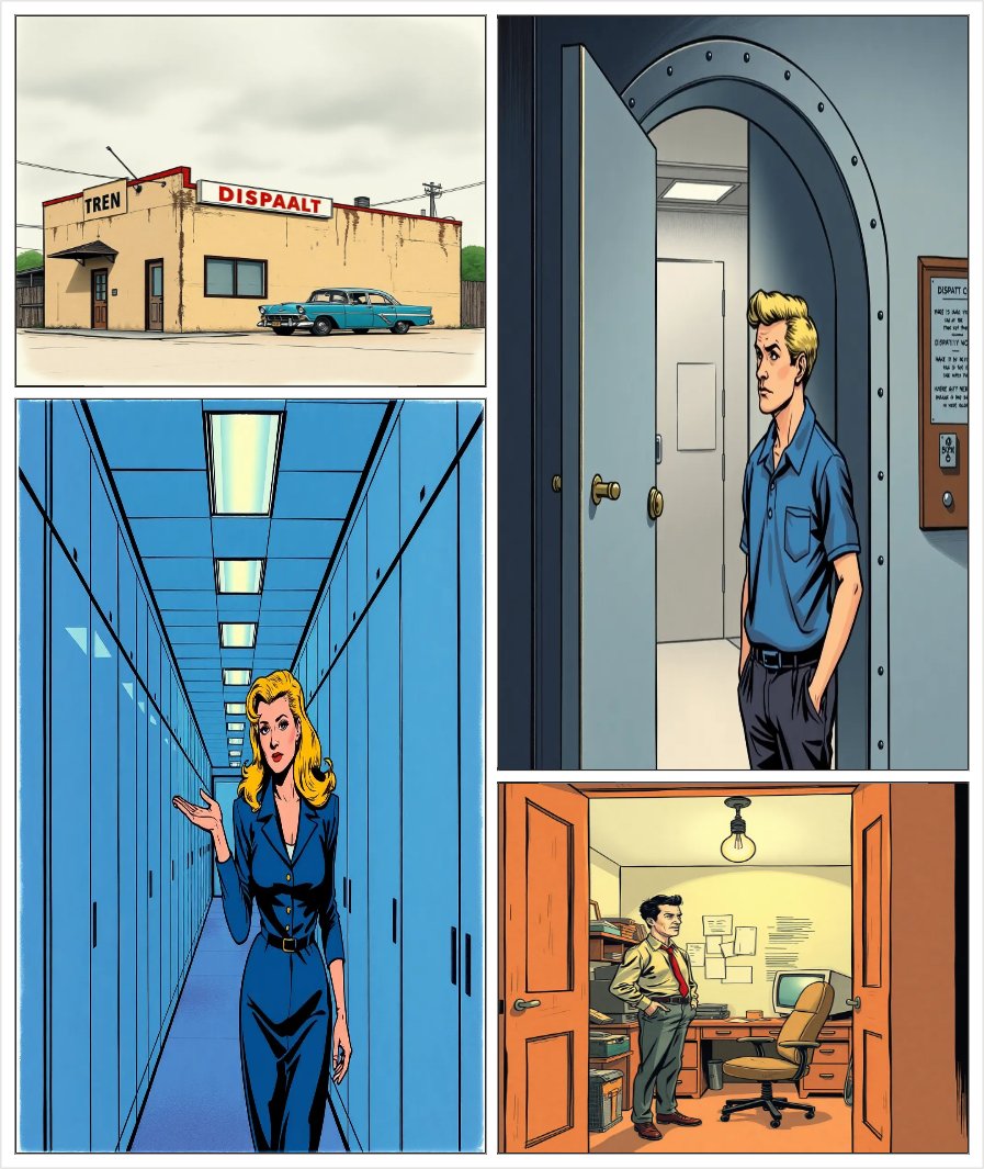 Λοιπόν το πρώτο καρε θα είναι έτσι θα φτιάχνουμε 4 καρέ οκ το πρώτο το κρατάμε σου ξαναγράφω το κείμενο " Έφτασα ..... Μια απόσπαση επιστάτη είναι , τι μπορεί να πάει στραβά ;" Στο δεύτερο θανάτου ανοίγει την πόρτα μια ξανθιά κυρία γύρω στα εξήντα λίγο ξινή ο Λάκης θα λέει " Καλημέρα!" Και η ξανθιά θα απαντάει " Εσύ είσαι ο καινούργιος μάλλον.....καλώς όρισες " Στο τρίτο θα μπαίνει με την ξανθιά σε ένα γραφείο και θανάτου λέει η ξανθιά εδώ είναι το γραφείο σου πιο πίσω σε άλλο γραφείο θα κάθεται
