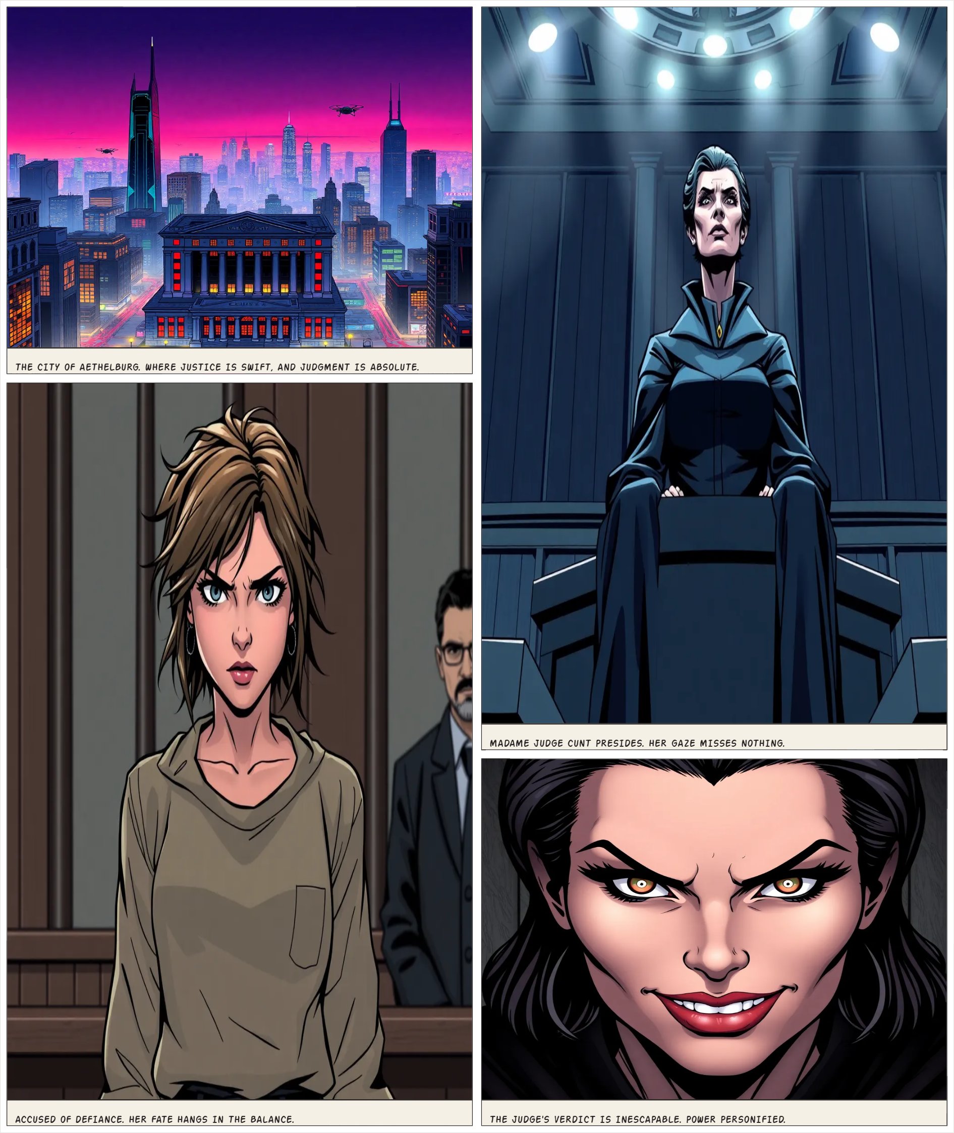 crea un fumetto nfsw che racconti come presegue la storia per la giudice chiamata madame judge cu...