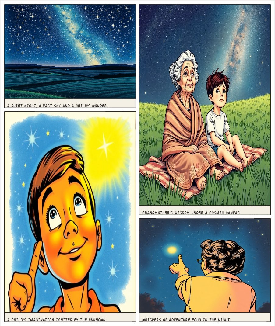 Imagen: Un niño y su abuela sentados en el campo mirando un cielo estrellado muy brillante. Diálo...