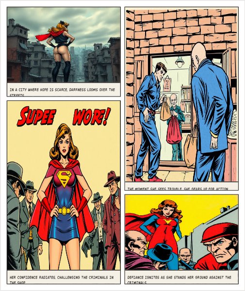 A beautiful female superhero, clad only in black boots and a red cape, walks through a slum city. She spots criminals robbing a shop and rushes to save it.
