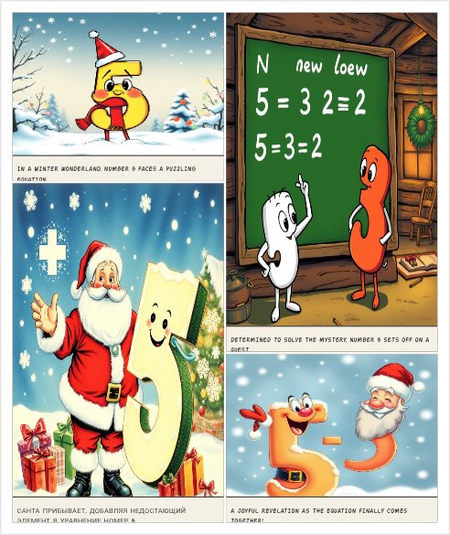 Число 5 готовится к Новому Году. Оно видит уравнение: 5 _ 3 = 2. Там нет знака минус, и уравнение не верное. 5 переживает и ищет минус. Приходит Дед Мороз, достаёт минус и ставит: 5 - 3 = 2. Всё правильно! 5 радуется, Дед Мороз говорит, что минус важен. Все поздравляют с Новым Годом!!!