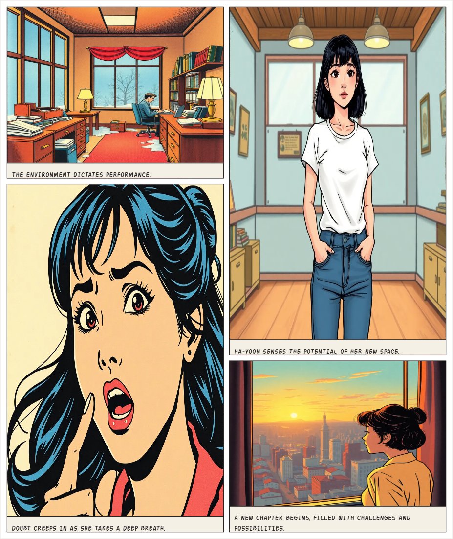 944 SCENE 1: MOVING IN (The Calm Before the Storm) Panel 1: Wide shot of a small student studio apartment. It's small but immaculate. Boxes are stacked high, all labeled in perfect handwriting ("Books," "Winter," "Office"). Narration (Ha-Yoon): Rule number 1: The environment dictates performance. MANWHA WEBTOON STYLE