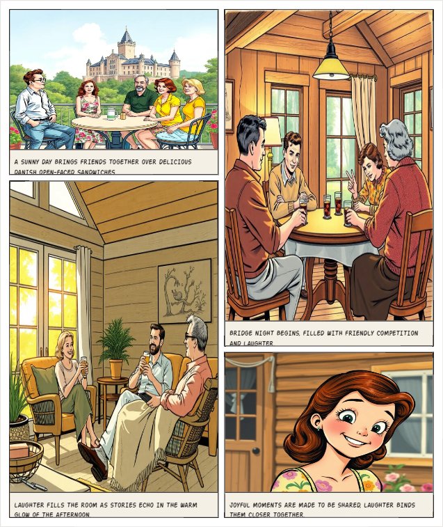 { "action": "image_generation", "input": "A 4-panel comic strip featuring five adults (Anders, Anne Sofie, Christian, Jørgen, and Karen) who resemble the provided photos. Panel 1: They are eating 'smørrebrød' on a sunny terrace in Sønderborg with the castle in the background. Panel 2: Inside a cozy wooden summer house in January, four of them are playing Bridge at a table while Anne Sofie brings drinks. Panel 3: They are relaxing with drinks in a golden afternoon light inside the summer house. P