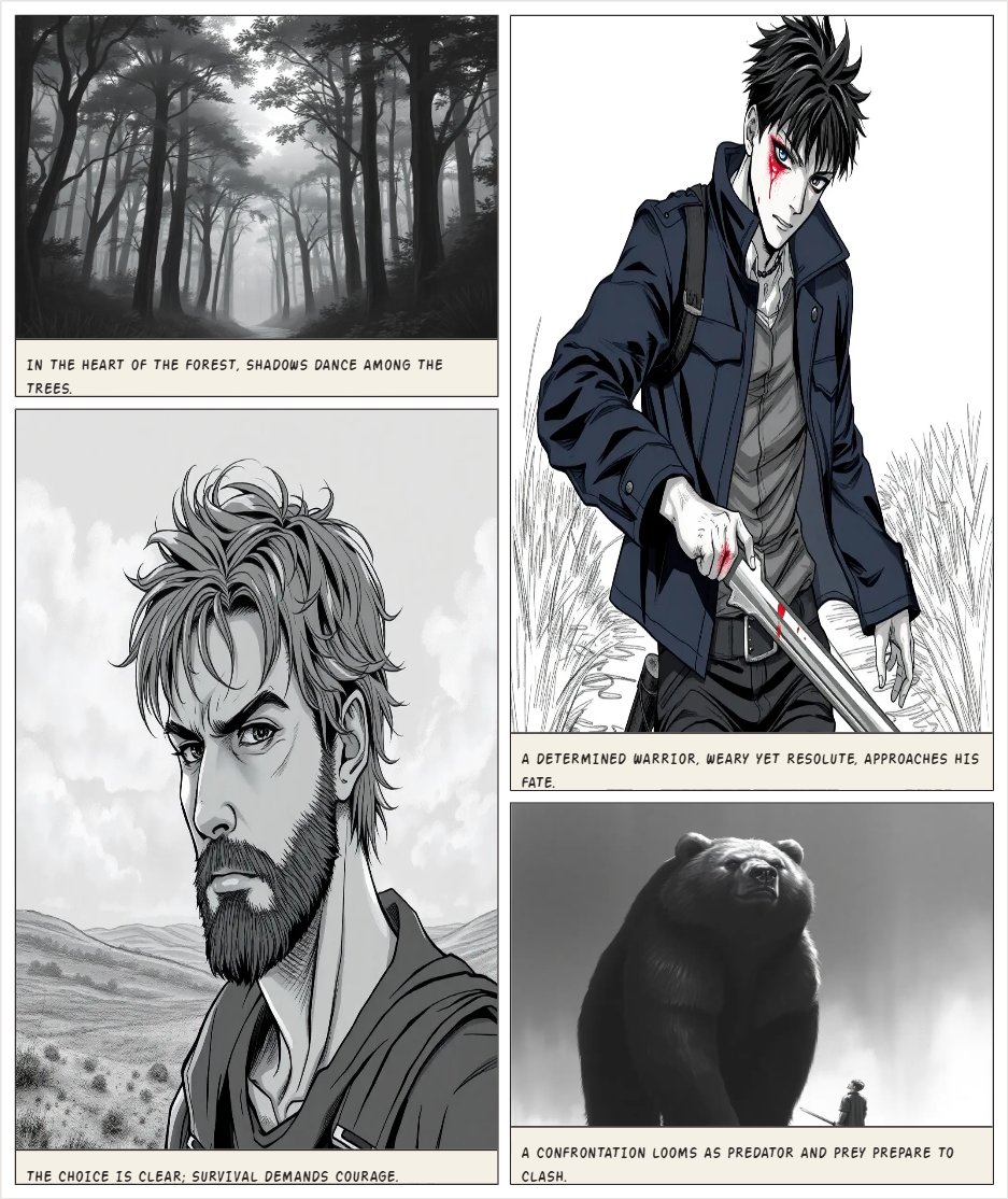 A wounded man walks through a dark, dense forest toward a large bear. He wears a dark blue half-...