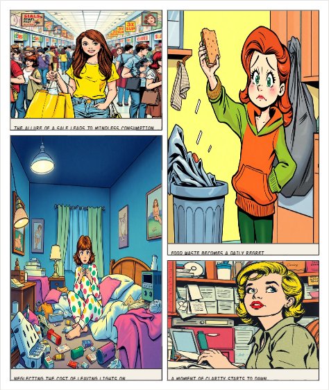 Create a short comic about mindful consumption. The main character is a teenager making everyday choices. In the first panels, show unconscious habits: buying things they don’t need, throwing food away, leaving lights on, using single-use items. Use exaggerated visuals to show waste piling up in the background. In the next panels, the character pauses and starts making mindful choices: reusing items, sharing, repairing, choosing less.