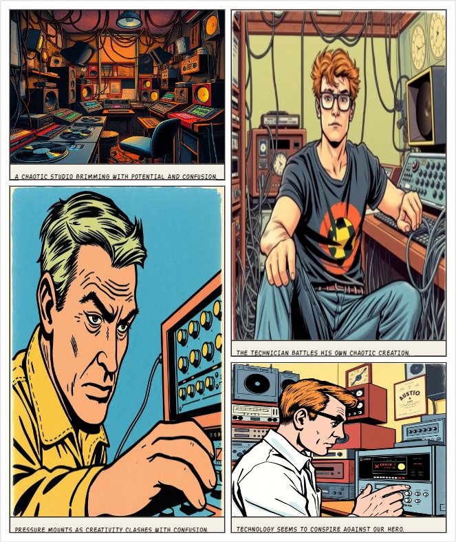 Un tecnico ingarbugliato tra cavi, mixer, giradischi, cassette audio