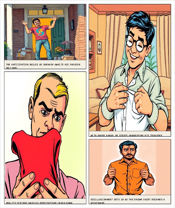 Minutes later—voilà! The delivery arrives at his doorstep, like a speedy little fashion genie. But when Subhash unwraps his eagerly awaited shirt, the plot thickens. The color isn’t quite as vibrant as the photos promised, and the fit isn’t exactly the dream match he’d pictured. Expectations and reality do a little dance, and Subhash is left feeling a bit let down. It’s a small tale of online shopping haste, where the picture-perfect dream didn’t quite match the reality. But hey, every story’s g